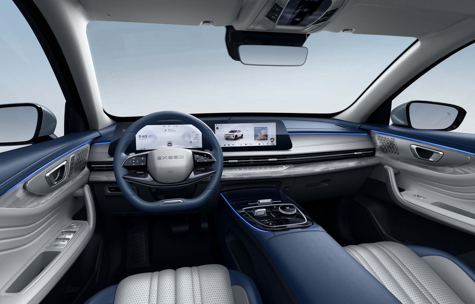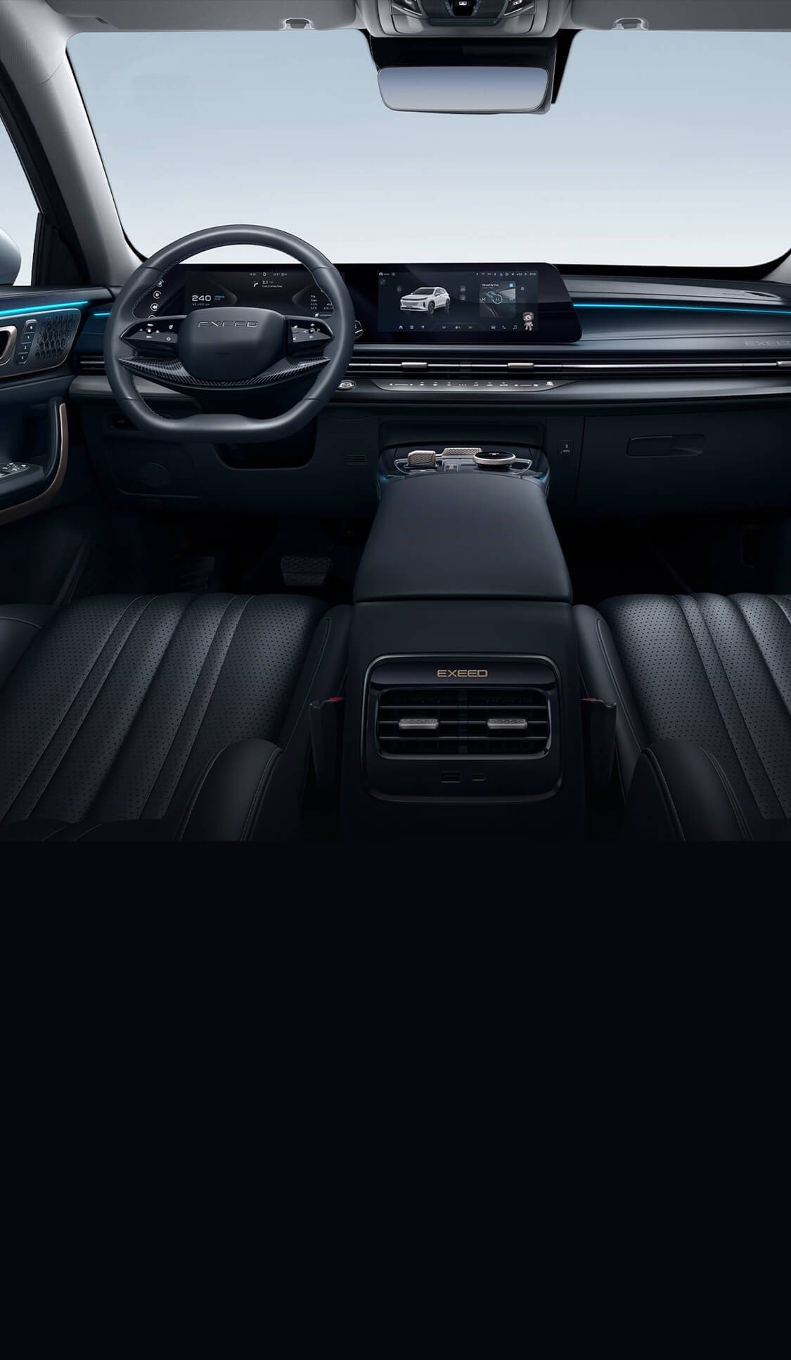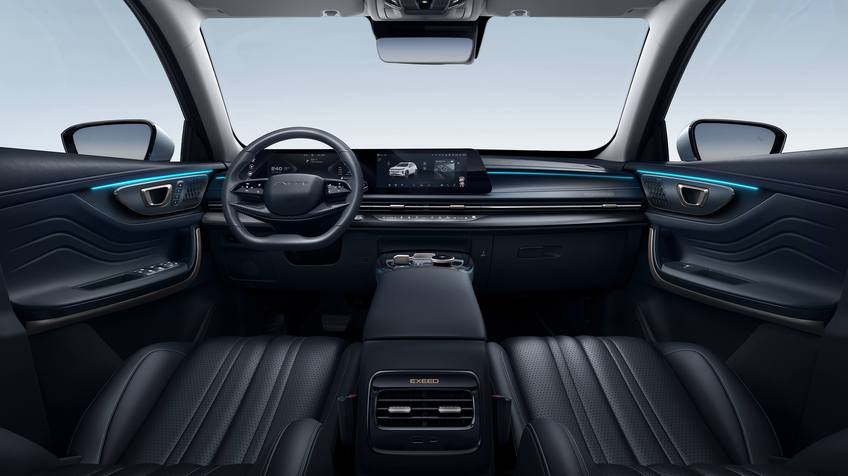 Integrated LCD dual screen, true curved screen, curvature up to 3000, industry leading, resolution 1920*720 HD screen, fully surround immersive visual experience, centered around the driver display, unique in the same class, the largest.